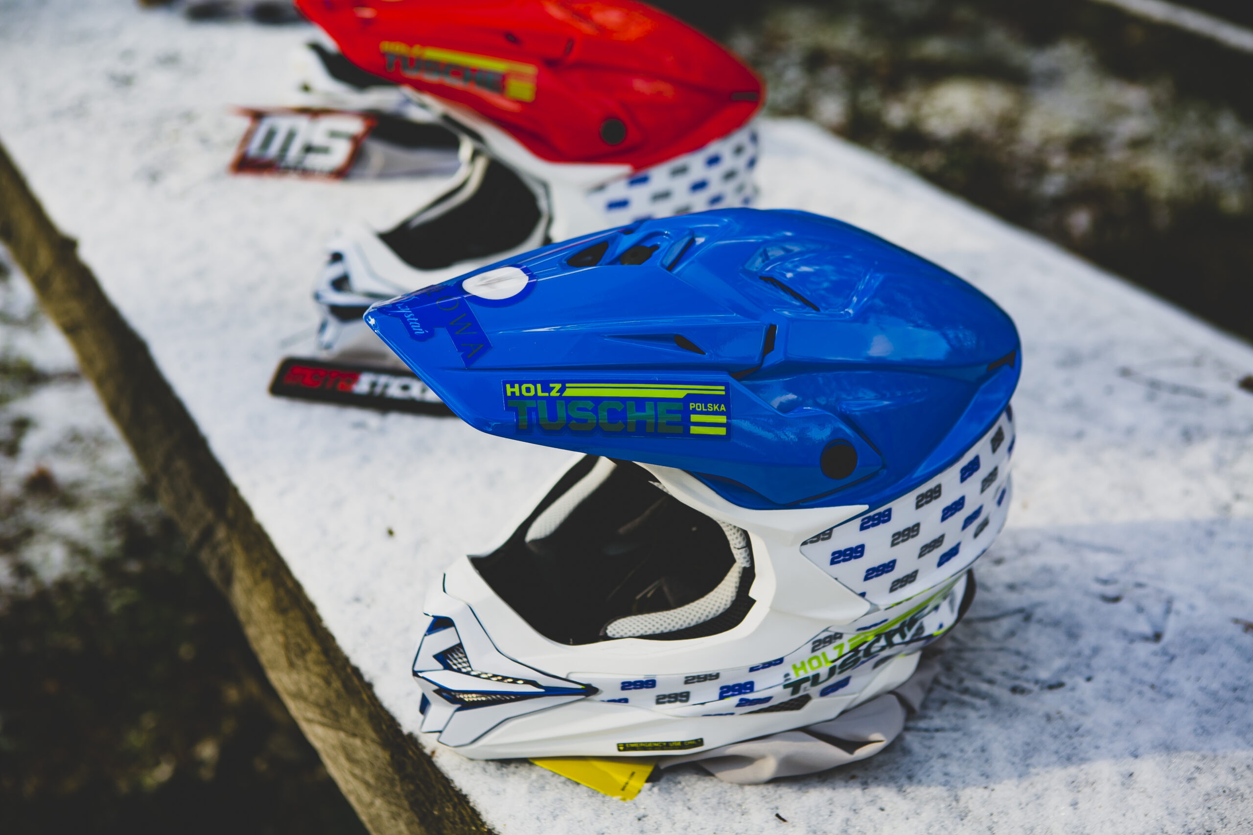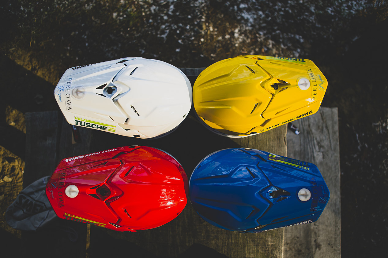 Przygotujemy kaski oklejone w połowie okleiną. Górną część możemy przygotować w malowaniu wymaganym regulaminem PZM.